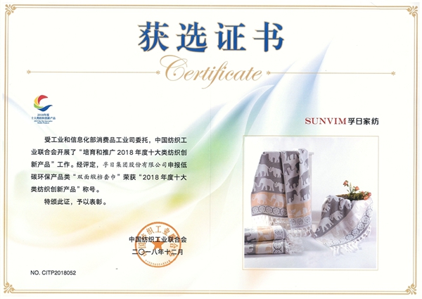 2018年1211日,以“大变局 新格局:趋势与展望”为主题的中国纺织创新年会在北京举行。孚日集团凭借在技术创新、产品研发等方面的探索和成绩,入选首批“中国纺织行业工业设计中心”,并荣获“中国纺织联合会产品开发贡献奖”,“双面缎档套巾”和“镂空远红外印花床品”上榜“2018年度十大类纺织创新产品”。