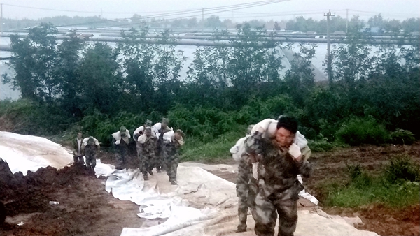 险情就是集结号,救灾就是冲锋号。满是泥泞的救灾现场,临时砖路的旁边就是深浅不一的河沟。在往返两千多米的泥路上,孚日民兵留下了奋战的身影,在机械设备难以进场的情况下诠释了强大的战斗力。带队上阵的李洪甲已年近半百,仍毅然和队员们还一起肩扛沙袋向着岸堤冲锋。