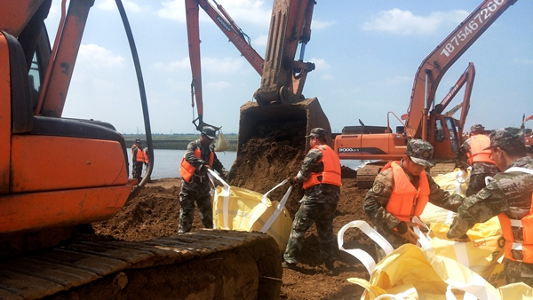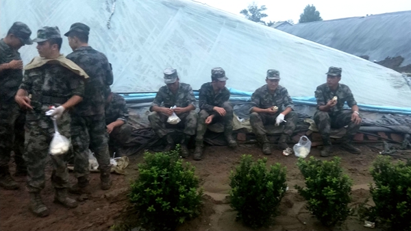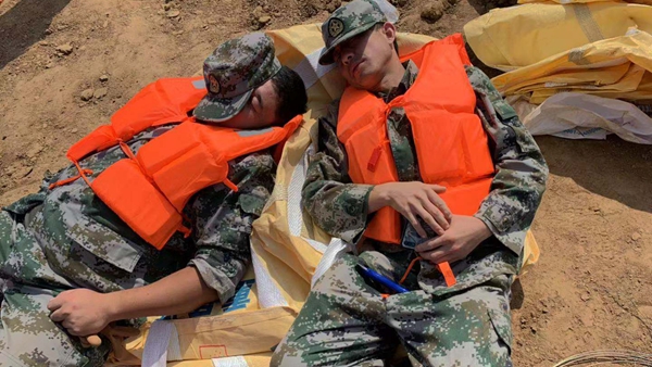 8月15日,孚日集团民兵分队搭乘冲锋舟,前往张僧河东岸装填沙袋,参与完成最后的决堤合拢任务。挖掘机等大型机械投入救灾,民兵们的号子声、脚步声和机械作业声交织,大家意志坚定为同一个目标拼搏,终于将肆虐的洪水拦在了河道之内。至此,民兵们已经好几天没见过床了——累了,他们就地休息,饿了,他们匆忙进食。