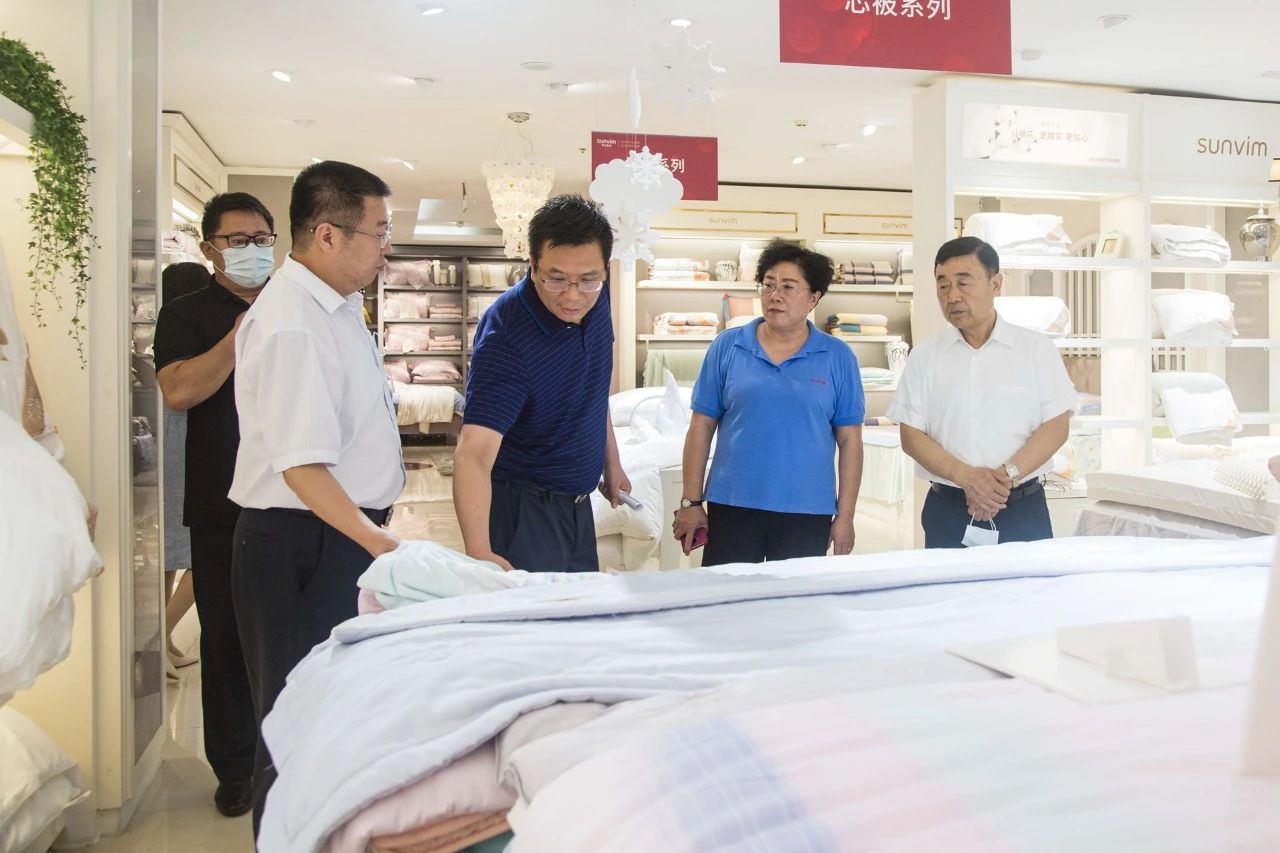 在参观家纺产品时,陈达一行现场感受了孚日集团出口亚洲、欧洲、美洲、澳洲等国际市场,以及以孚日、洁玉、赛维丝等自有品牌开拓国内市场的系列产品。